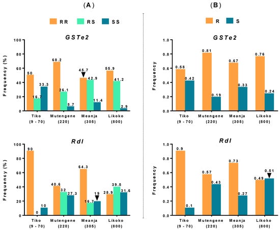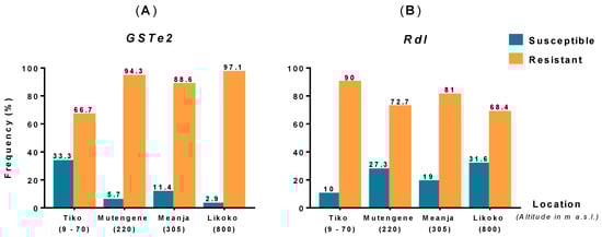 Specifically, GSTe2 mutation had an overall frequency of 64.3% (218/339) for homozygote-resistant mosquitoes (RR), 29.2% (99/339) heterozygotes (RS) and 6.5% (22/339) homozygotes susceptible (SS). A predominance of homozygote-resistant genotypes was observed throughout the study area being 50% (3/6) in Tiko, 68.2% (180/264) in Mutengene, 45.7% (16/35) in Meanja and 55.9% (19/34) in Likoko (Figure 3A). Increased frequencies of GSTe2 heterozygotes were noted with the climb in altitude, whereas the occurrence of susceptible mosquitoes decreases with land elevation. Meanwhile, for Rdl mutation, although homozygotes-resistant mosquitoes almost dominated across the study area (Tiko: 90% (9/10), Mutengene: 40.6% (25/128), Meanja: 64.3% (27/42), Likoko: 28.9% (11/38)), the frequencies of heterozygotes and susceptible mosquitoes followed reverse tendencies to those of GSTe2. For both makers, Chi-square test statistical analysis of genotype frequency distributions between localities showed significant differences except in Tiko/Meanja (GSTe2: p = 0.273, Rdl: p = 0.244), Mutengene/Likoko (GSTe2: p = 0.17, Rdl: p = 0.423) and Meanja/Likoko (only GSTe2: p = 0.354).