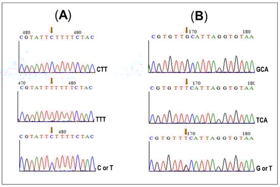 A point mutation (CTT to TTT) at position codon 119, inducing an amino acid change of leucine to phenylalanine (L119F) and which confers resistance to pyrethroids in An. funestus s.s. mosquitoes, was observed in all GSTe2-resistant samples of Mount Cameroon (Figure 4A). Likewise, the GCA (alanine) to TCA (serine) mutation at position codon 296 (A296S) was observed in An. funestus s.s. dieldrin-resistant samples (Figure 4B).