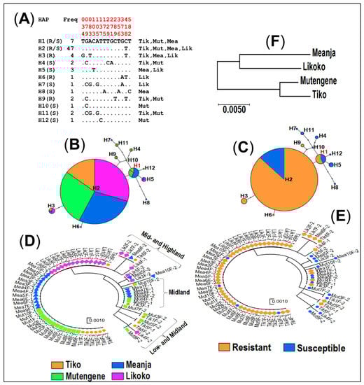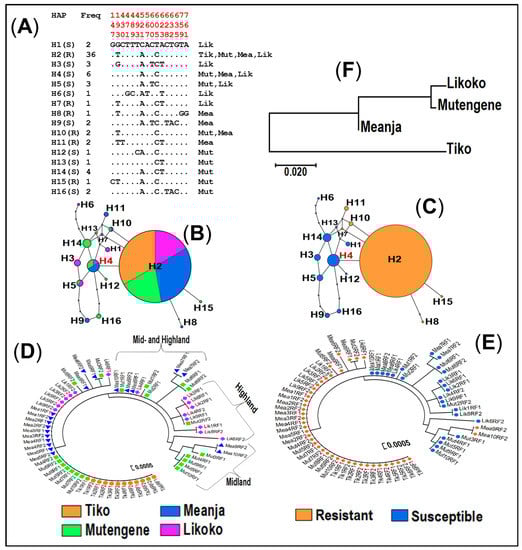 The most common haplotype (H2: 36/68 sequences) was found to be carrying the 296S-resistant allele and was distributed throughout the study area (Figure 6A–C), unlike the ancestral haplotype (H4: 6/36 sequences), which carried the A296-susceptible allele and was distributed at low (Tiko: 9–70 m a.s.l.) and mid (Mutengene: 220 m a.s.l.; Meanja: 305 m a.s.l.) altitudes but not in highland (Likoko: 800 m a.s.l.). Approximately one third of the haplotypes (6/16) appeared as singleton in A296 (H6, H12 and H13) and 296S (H7, H8 and H15) allele carries, and were identified from midland (Mutengene: H12, H13 and H15; Meanja: H8) to highland (Likoko: H6 and H7).