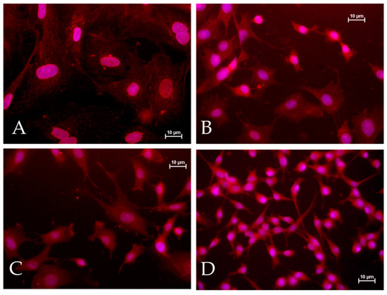 Cells were cultured on coverslips for 48 h. Then, they were fixed with 96% ethanol, on ice, for 10 min and permeabilized for 5 min with 0.25% Triton X-100, in PBS. Cells were finally incubated with rabbit polyclonal anti-glial fibrillary acidic protein (GFAP) (Sigma-Aldrich, St. Louis, MO, USA). The secondary antibody was anti-rabbit-IgGs, conjugated to rodhamine (Sigma-Aldrich, St. Louis, MO, USA). Nuclear DNA was also stained with 4’-,6-diamino-2- phenylindole (DAPI; Vector Laboratories, Youngstown, OH, USA). The samples were finally observed in an Olympus BX-50 microscope (Olympus Italia s.r.l., Segrate, Italy) equipped with Vario Cam B/W camera (Nikon Instruments s.p.a., Calenzano, Italy).