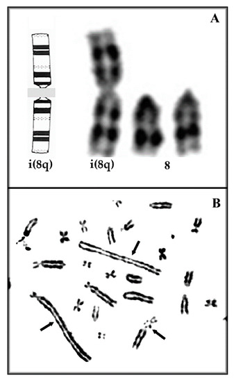 Representative clonal chromosome aberrations seen in A-FC6. (A) Ideogram reconstruction and isochromosome #8 seen in 100% of metaphases, (B) dicentric and triradial chromosomes (arrows).