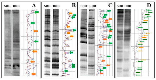 MeSAP DNA-Fingerprinting and relative densitometer scanning of primary astrocytes (A) and clones (B–D). The yellow arrows indicate appearing/disappearing and the green ones indicate attenuation/intensification of bands. By analyzing band pattern differences between single-digested DNA (SDD) and double-digested DNA (DDD) it is possible to evidence 7 variations in primary astrocytes (A), 11 in A-GS1(B), 21 in A-VV5 (C) and 25 in A-FC6 (D).