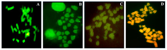 In order to determine the cytogenetics differences in the three new cell lines, with respect to the standard karyotype of Norway rat (2n = 42) [40], they were cultured in triplicate in 75 cm2 flasks, as previously reported [41]. A suitable number of cells was initially seeded so that the culture never left the exponential growth phase. The doubling time of each cell line was obtained based on the number of metaphases obtained after treatment with colcemid (0.1 µg/mL). Colcemid treatment was performed 3 h before the trypsinization. The cultures were then processed according to the conventional air-drying protocol, as described previously [42,43]. Some of the slides obtained were used for standard Giemsa stain, others for G-banding [44], or for subsequential cytogenomic analyses. For each cell line, the modal karyotype was determined on 100 photographed metaphases, after standard Giemsa stain, while 30 G-banded metaphases of each cell line were examined to determine the presence of aneuploidies and/or structural aberrations [45].