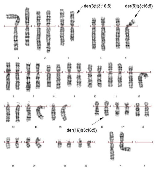 A primary cytogenetic analysis was performed on the 72-h lymphocyte culture derived from the patient’s peripheral blood. GTG differential staining of metaphase chromosomes revealed a balanced translocation involving chromosomes 3, 5, and 16. Patient’s karyotype was described as 46,XX,t(3;16;5)(q25;q21;p15.1) (Figure 1).
