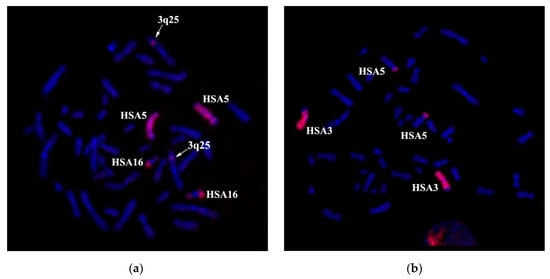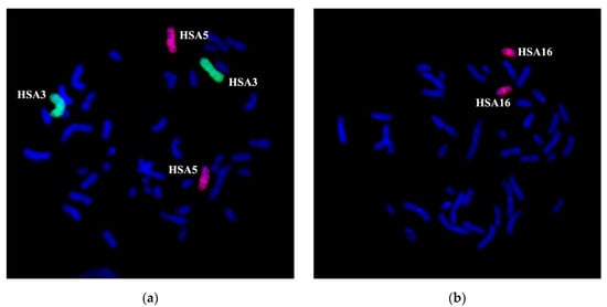 Two-color chromosomal in situ suppression (CISS) hybridization with WCP3 (green)/WCP5 (red) (a) and WCP16 (red) (b) on metaphase chromosomes of a healthy donor. Whole chromosome painting probes (WCPs) intensely painted original chromosomes. The general staining of chromosomes with 4’,6-Diamidino-2-phenylindole dihydrochloride (DAPI) in blue. Chromosomes are marked as human chromosome 3 (HSA3), human chromosome 5 (HSA5), and human chromosome 16 (HSA16).