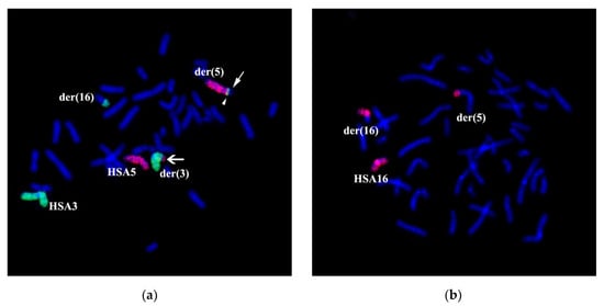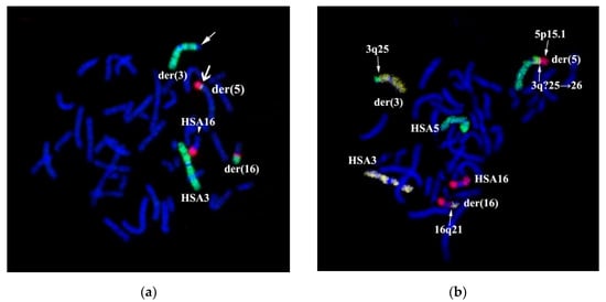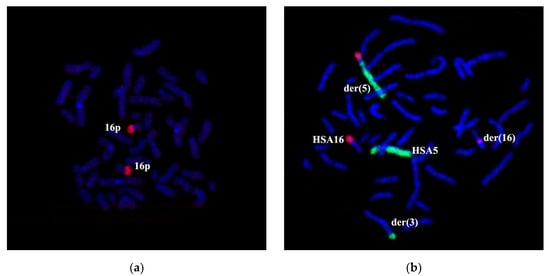 CISS hybridization with PCP16p (a) and WCP5 (green)/PCP16q(red) (b) on the patient’s metaphase chromosomes. (a) PCP16p DNA probe that is homologous to the short arm of chromosome 16 (red). Chromosomal regions where the specific signal was detected are indicated: 16p—short arms of chromosomes 16 and chromosome 16 derivative. (b) Chromosomal regions where the specific signal was detected are indicated: HSA5, HSA16—intact chromosomes 5, 16. der(3), der(5), der(16)—chromosomes 3, 5, and 16 respective derivatives. Chromatin DAPI staining is in blue.