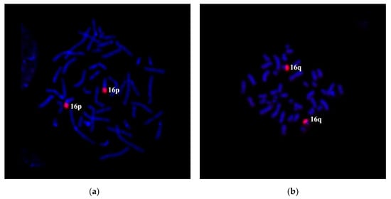 Quality control for microdissection DNA probes homologous for short and long arms of chromosome 16. CISS-hybridization of DNA probes PCP16p (a) and PCP16q (b) on metaphase chromosomes of a healthy donor. DAPI staining is in blue. Both 16p and 16q indicate the short and the long arm of chromosome 16, respectively.