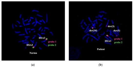 CISS hybridization with PCP3q25→q26 (probe1) and PCP3q25→qter (probe 2) on chromosomes of a healthy individual (a) and the patient (b). Chromosomes with signals are indicated: HSA3—intact chromosome 3, der(3), der(5), and der(16)—derivatives of chromosomes 3, 5, and 16, respectively.