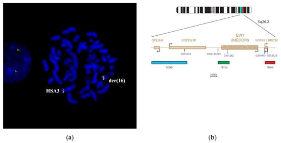 The analysis of 3q26.2 chromosomal segment. (a) FISH EVI1 Breakapart Probe on the patient’s chromosomes. (b) Scheme of EVI1 Breakapart Probe homology. The EVI1 3q26.2 product consists of a 158 kb probe, labeled in red, telomeric to the D3S4415 marker and including the LRRC34 gene, a green probe covering a 181 kb region, including the entire EVI1 gene and flanking regions and a blue probe, which covers the 563 kb region centromeric to the EVI1 gene, including the D3S3364 marker. Signal was detected at chromosomes 3 and der(16). Chromatin DAPI staining is in blue.