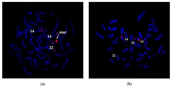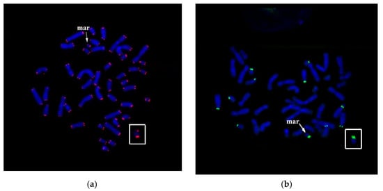 Interestingly, most of the sSMCs derived from acrocentric chromosomes are inverted duplications of the short and a part of the initial chromosome’s long arm. The lack of nucleolus organizer region on the second arm suggests that sSMC was formed after deleting a big part of an acrocentric chromosome’s long arm. Alternatively, it is the result of translocation. Previously, sSMCs, which include a proximal region of the initial chromosomes and other regions, have been described [23,24,25,26,27]. In some cases, Ag-NOR staining detects regions other than the nucleolus organizer region. FISH with labeled human rDNA (rDNA probe) or labeled human DNA of a telomere repeat (TTAGGG)n. Tel-DNA probe (Figure 11a,b) was performed to confirm the presence and the stability of nucleolus organizer region within sSMC.