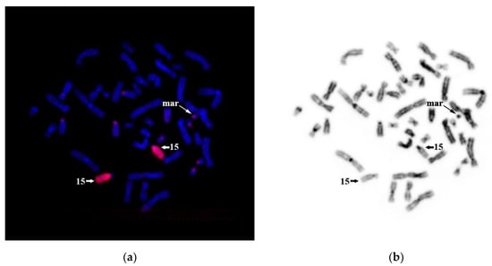 CISS hybridization with WCP15 DNA probe on the patient’s metaphase chromosomes. (a) WCP15 DNA probe-stained chromosome 15 (red). A weak signal in nucleolar organizer regions (NORs) of acrocentric chromosomes. (b) Inverted DAPI banding. No. 15—indicates the homologs of chromosome 15. mar—indicates sSMC.