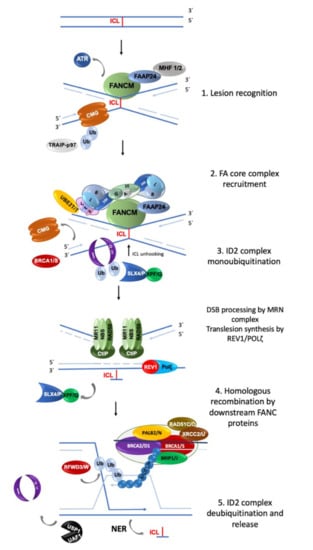 The FA/BRCA pathway is activated for repairing ICLs during the S phase of the cell cycle, when the replisome finds an ICL and two convergent replication forks become stalled [11]. The ICL repair process can be divided into modules of activity of the FA/BRCA pathway [12] (Figure 1).