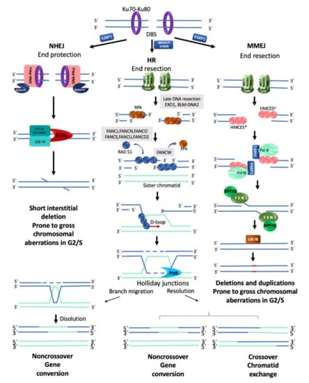 Major mechanisms of double-strand break repair. NHEJ, Non-Homologous End Joining. DNA ends are protected by KU70/KU80, which prevents their end-processing. When the ends are incompatible, a segment of up to four nucleotides is detected, Artemis eliminates the remaining incompatible segments and ligation is carried out by LIGIV-XRCC4. This pathway can repair a DSB without chromosome modification; however, during S/G2 and in the presence of several DSBs, it is considered prone to generate chromosomal alterations. HR, Homologous Recombination. This pathway is only available during the S/G2 phases of the cell cycle since it requires a homologous template; HR is the best choice to maintain sequence fidelity because in general it repairs in an error-free manner. A ssDNA 3′ overhang is produced by the action of the MRN-CtIP complex; it is first covered by RPA proteins which are later replaced by RAD51 to form the nucleoprotein strand that will carry out the invasion of the DNA of the sister chromatid in order to use it as a template to restore the continuity of the original nucleotide sequence. MMEJ, Microhomology-Mediated End Joining. PARP1 prevents KU70/KU80 binding to DNA ends and allows the recruitment of MRN-CtIP to initiate end-resection, creating a short 3′ overhang. This overhang is preferentially covered by HMCES which channels the damage to be repaired by MMEJ instead of HR. PARP1-POLQ search for microhomology of 2–20 bp and align the strands. The resulting flaps are eliminated by XPF/FANCQ-FEN1. Alternatively, POLQ can direct DNA synthesis to add nucleotides to make DNA ends compatible; this end processing generates in situ deletions and duplications. In addition, if this pathway is active during S/G2, and several DSBs coincide in time and space, gross chromosomal aberrations are formed because, similar to NHEJ, they do not require long stretches of homology to ligate the DNA ends [23,26]. * RPA or HMCES (5-hydroxymethylcytosine binding, embryonic stem cell-specific protein) [26,28].