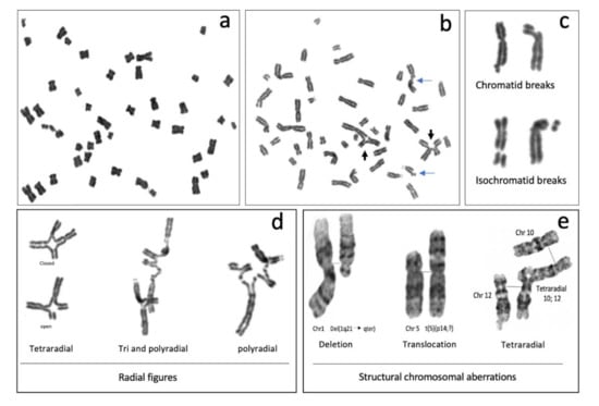 Representative metaphases and common structural chromosome aberrations observed in FA cells cultured with 0.1 µg/mL DEB: (a–d) peripheral blood lymphocytes from a patient with FA and (e) from a patient derived, FANCA mutated VU817 lymphoblastoid cell line. (a) Endoreduplication. (b) Metaphase with structural chromosomal aberrations; blue arrows show chromatid breaks and black arrows show radial figures. (c) Breaks. The images show how the broken fragments are kept very close to the chromosome that originated them because there is a cohesion of chromatids in metaphase. (d) Radial figures. In the first column can be observed that the tetraradial can be closed when the four DNA ends of the two non-homologous chromosomes are rejoined or open when only two of the four DNA ends were rejoined. (e) GTG banded chromosomes reveal other gross structural chromosomal aberrations that may be found in FA cells, such as deletions and translocations. In the radial figure, normal chromosomes 10 and 12 are aligned with the tetraradial, to highlight the trajectory of the rearrangement.