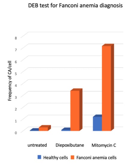Response of lymphocytes from FA patients (n = 18) and healthy subjects (n = 117) to treatment with ICL inducing agents, Diepoxybutane [0.1 µg/mL] and mitomycin C [40 ng/mL]. Gross chromosomal aberrations such as radial figures, translocations, deletions and duplications were commonly observed in FA cells [49] Although the two challenge agents are effective, the use of DEB for diagnosis is preferred, because the results are less variable and the difference between non-FA vs. FA cells is generally clearer.