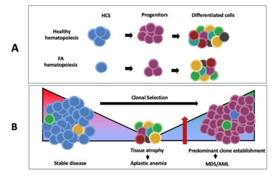 As mentioned in the previous sections, the DNA repair deficiency that characterizes FA leads to accumulation of unrepaired DNA damage with cellular and physiological consequences [64]. When facing DNA damage, every cell has to make the decision whether to divide or not based on the amount of DNA damage that the cell is harboring.