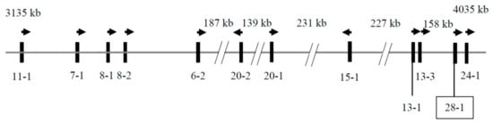 Location of KRTAPs on caprine chromosome 1. The identified KRTAP28-1 sequence is shown in the box, together with eleven previously identified KRTAPs. The vertical bars represent the KAP genes and the names of these genes are identified below the bars (e.g., 28-1 represents KRTAP28-1). The arrows indicate the direction of transcription. The spacing of these genes is only approximate and is based on the Caprine Genome Assembly, as are the nucleotide coordinates.