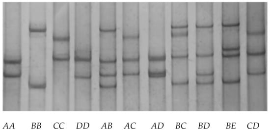 Representative PCR-SSCP patterns of the caprine KAP28-1 gene. Five unique banding patterns representing five variants (A–E) were shown in either homozygous or heterozygous forms.