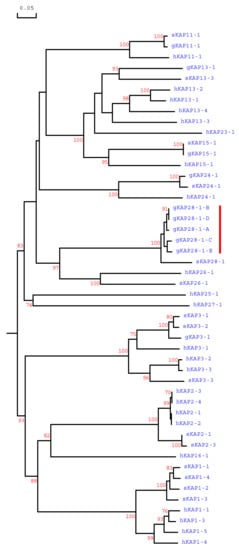 Maximum parsimony tree of the high sulphur KAPs identified in goats, sheep and humans. The tree was constructed using the amino acid sequences (or predicted amino acid sequences). The numbers at the forks indicate the bootstrap confidence values, and only those equal to, or higher than 70%, are shown. The caprine, sheep and human KAPs are indicated with a prefix “g”, ‘s” and “h”, respectively. The five newly identified goat KAP28-1 sequences are indicated with a red vertical line, and the GenBank/EMBL accession numbers for other HS-KAPs are: NM_001285774 (gKAP3-1), NM_001285767.1 (gKAP11-1), AY510115 (gKAP13-1), MG996011 (gKAP24-1), X01610 (sKAP1-1 and sKAP1-4), HQ897973 (sKAP1-2), X02925 (sKAP1-3), P02443 (sKAP2-1), P02441 (sKAP2-3), P02446 (sKAP3-1), P02444 (sKAP3-2), P02445 (sKAP3-3), HQ595347 (sKAP11-1), JN377429 (sKAP13-3), KX817979 (sKAP15-1), JX112014 (sKAP24-1), KX644903 (sKAP26-1), MN053915 (sKAP28-1), NM_030967.2 (hKAP1-1), NM_030966.1 (hKAP1-3), NM_001257305.1 (hKAP1-4), NM_031957.1 (hKAP1-5), NM_001123387.1 (hKAP2-1), NM_033032.2 (hKAP2-2), NM_001165252.1 (hKAP2-3), NM_033184.3 (hKAP2-4), NM_031958.1 (hKAP3-1), NM_031959.2 (hKAP3-2), NM_033185.2 (hKAP3-3), NM_175858.2 (hKAP11-1), NM_181599.2 (hKAP13-1), NM_181621.3 (hKAP13-2), NM_181622.1 (hKAP13-3), NM_181600.1 (hKAP13-4), NM_181623.1 (hKAP15-1), NM_001146182.1 (hKAP16-1), NM_181624.1 (hKAP23-1), NM_001085455.2 (hKAP24-1), NM_001128598.1 (hKAP25-1), NM_203405.1 (hKAP26-1) and NM_001077711.1 (hKAP27-1).