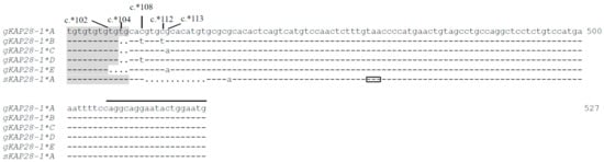 Sequence variation in KRTAP28-1 has been studied in sheep []. Despite the observation that the KAP28-1 gene is polymorphic in both sheep and goats, the nature of the sequence variation detected in the two species appears to be different. With sheep, the vast majority of variation in sequence is located in the coding regions except for c.-30T/G []. In contrast, nucleotide sequence variations in the non-coding regions were found to predominate in goats. This suggests that the polymorphism observed in these two species may be derived by different mechanisms. It is also notable that for both species, all of the coding region sequence variation was non-synonymous.