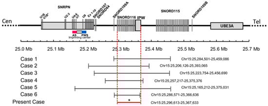 Here, we report a 17-year-old boy who met six of the seven major revised clinical criteria for diagnosis of Prader–Willi syndrome, including neonatal hypotonia, feeding difficulties and failure to thrive as an infant, excess weight gain and hyperphagia by age 3, global developmental delay, and dysmorphic facial features. Unlike many children with PWS, from age 4 onward, his height followed the 90–95th percentiles, and he had spontaneous onset of puberty by age 15. Methylation analysis of the SNURF-SNRPN exon 1 region showed a normal pattern in the proband. However, further genetic analysis using exome sequencing identified a heterozygous microdeletion of 71 kb in size, spanning at least chr15:25296613-25367633 (genome build hg 19; Figure 1). This deletion results in the loss of several of the PWS-associated non-coding RNA species, including the SNORD116 cluster. In the literature, only six PWS cases that were caused by small atypical deletions spanning snoRNAs at 15q11.2 have been reported before, with deletion sizes ranging from 80 to 236 kb (see Table 1), all of which overlap the SNORD116 region [,,,,,]. Altogether, these rare cases provide further insights into genotype–phenotype correlations.