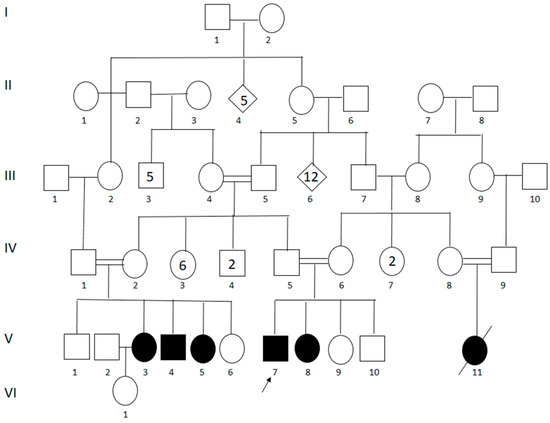 Genealogical tree revealing consanguinity. V3: case 1; V4: case 2; V5: case 3; V7: case 4; and V8: case 5. Numbers inside of the symbols represent the sum of the individuals with this standard representation.