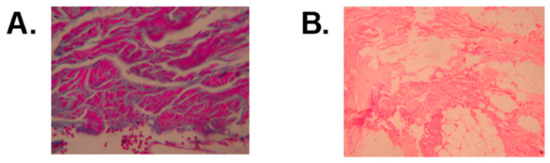 (A). Mason’s trichromic stain histopathological view that reveals hypertrophy, atrophy and normal striated muscle fibers that are surrounded by fibrosis and perimysial fat; magnification 10×. (B). Hematoxylin–eosin stain that shows striated muscle with intermingled hypertrophic, atrophic, and normal fibers that are surrounded by a proliferation of collagenous fibro connective tissue that is replaced, in other instances, by adipose tissue; magnification 4×.