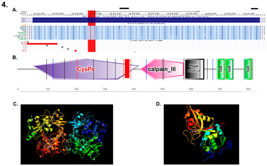 (A) Localization of the mutation consisting of a DNA deletion of four bases (TGCC) in exon 3 of the CAPN3 gene (409–412 del TGCC) (red rectangle). (B) The mutation is located within the calpain-like thiol protease family (peptidase family C2) region, with the large subunit corresponding to a calcium activated neutral protease. (C) Main calpain 3 protein. (D) Domain I of the calpain 3 protein when the described mutation is present.