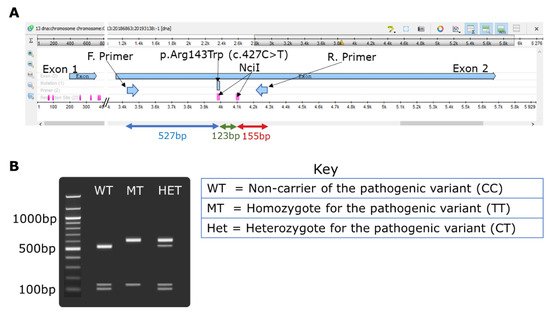 NciI restriction fragment polymorphism investigations for gap-junction protein β 2 (GJB2)-p.Arg143Trp (c.427C > T rs80338948) variant. (A) Unipro UGENE [31] map of GJB2 exon 2 showing the primer binding sites (F. primer and R. primer) and the restriction sites (CCSGG) for the restriction enzyme NciI and the resulting DNA fragments. (B) Expected gel electrophoresis result.