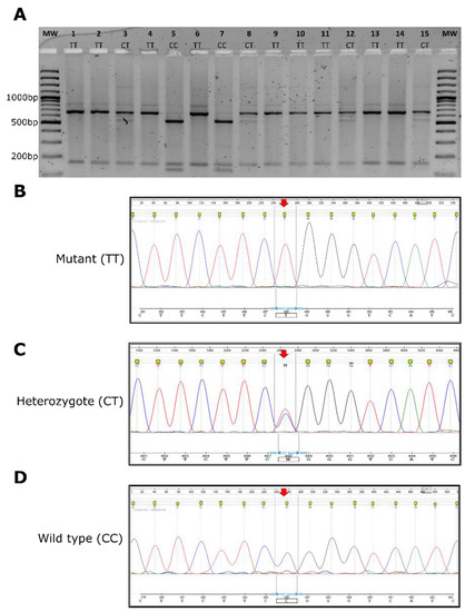 Seven (7) out of the 10 family members without hearing impairment were heterozygous (CT), thus having the p.Arg143Arg/p.Arg143Trp variant, while the rest had the p.Arg143 variant (Figure 3A).