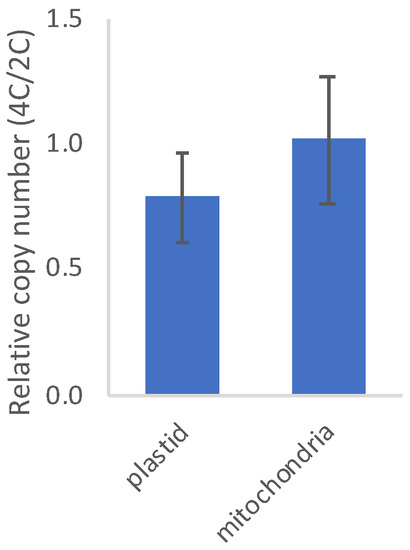 Quantitative PCR-based estimates of chloroplast- and mitochondrial-genome copy number relative to nuclear genome copy number in tetraploid vs. diploid rosette leaves.