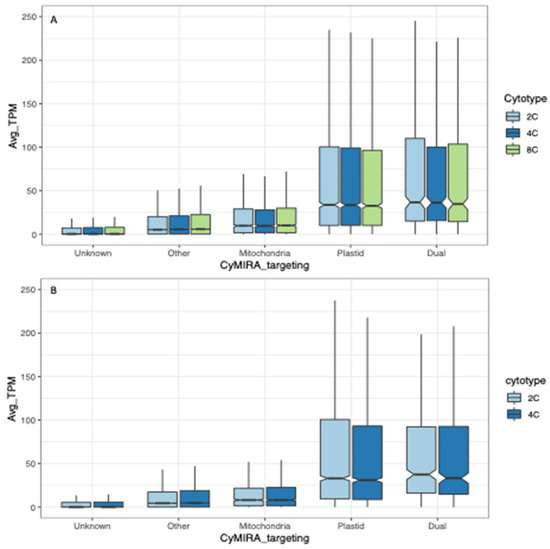 Expression level by subcellular target (obtained from the CyMIRA database) for nuclear genes in diploids (2C), tetraploids (4C) and octoploids (8C). (A) Sepals. (B) Leaves. For each cytotype, average transcripts per million (TPM) per locus was calculated for the 3–4 biological replicates per cytotype, and the distribution of these average values (Avg TPM; y-axis) was plotted by targeted compartment (x-axis).