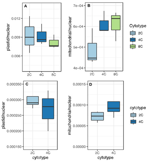 Ratios of organellar expression to nuclear expression. For each biological replicate per cytotype, total reads per organellar genome were divided by reads per nuclear genome. The distribution of organelle/nucleus ratios are shown. (A) Total plastid reads divided by total nuclear reads in sepals. (B) Total mitochondrial reads divided by total nuclear reads in sepals. (C) Total plastid reads divided by total nuclear reads in leaves. (D) Total mitochondrial reads divided by total nuclear reads in leaves.