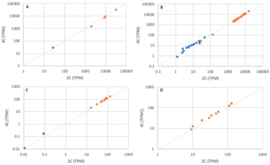 Expression (TPMs) in tetraploid leaves (4C; y-axis) vs. diploid leaves (2C; x-axis) for selected organellar protein complexes. (A) RuBisCO, (B) Photosystem II. (C) OXPHOS complex III, (D) OXPHOS complex II (all subunits encoded in the nucleus). Nuclear-encoded subunits are shown in orange, plastid- and mitochondria-encoded subunits in blue.