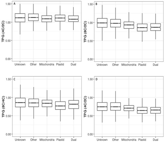 Transcripts per genome for nuclear genes by targeting class. (A) Tetraploid vs. diploid (4C/2C) in sepals. (B) Octoploid vs. diploid (8C/2C0 in sepals. (C) Octoploid vs. tetraploid (8C/4C) in sepals. (D) Tetraploid vs. diploid (4C/2C) in leaves.