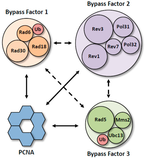 Composition of the putative bypass factors. Diagrams showing the protein components of putative Bypass Factor 1 (orange) containing pol η (Rad30), Bypass Factor 2 (purple) containing pol ζ (Rev3–Rev7–Pol31–Pol32), and Bypass Factor 3 (green) containing Rad5. Ubiquitin moieties are shown in red. Solid arrows represent direct interactions with PCNA that allow for the formation of PCNA tool belts. Dashed arrows represent interactions that allow for the formation of alternative architectures.