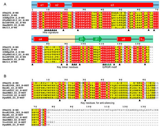 Multiple sequence alignment of the H-NS protein from Salmonella ser. Typhimurium LT2 and selected full-length (A) and short (B) homologs found in EARL genomic islands. The secondary structure elements of H-NS are represented with red cylinders (α-helices) and green arrows (β-strands). The blue, yellow, and green backgrounds represent the dimerization/oligomerization, linker, and DNA-binding domains, respectively. Numbers indicate the corresponding residue of the H-NS protein. The triangles under the alignment indicate the amino acid residues required for function of H-NS (A) or H-NST (B) that are also conserved in the homologs encoded by the EARL GIs. Aligned proteins correspond to H-NS from Salmonella ser. Typhimurium LT2 (STmLT2; WP_001287383.1), full-length homologs encoded in the EARL islands from Salmonella ser. Enteritidis P125109 (ROD21; WP_001287371.1), Klebsiella pneumoniae ST258 NJST258-2 (ICEKp258.2; WP_001588074.1), Salmonella ser. Typhi PM016/13 (StyPM01613_GI; WP_045354302.1), Escherichia coli SF-088 (EcoSF088_GI; WP_000005143.1), Serratia marcescens SM39 (SmaSM39_GI; WP_041035854.1), Pectobacterium atrosepticum SCRI1043 (HAI13; WP_011094424.1), and the short homologs encoded in the EARL islands from E. coli O127:H6 E2348/69 (EcoE2348_IE3; WP_000564595.1), K. michiganensis M1(KmiM1_GI; WP_038424693.1), Samonella ser. Sloterdijk ATCC 15791 (SsloATCC_GI; WP_023201852.1), S. marcescens UMH3 (SmaUMH3_GI; WP_089187391.1), Yersinia intermedia Y228 (YinY228_GI; WP_042569548.1), and P. parmentieri RNS08.42.1A (PpaRNS_GI; WP_033071994.1). The multiple alignment was made in MEGA X [116] using MUSCLE, and the graphic representation was made using ESPript3 [117]. The complete alignment of all 34 full-length and 20 short homologs found in EARL islands is provided as Supplementary Figures S1 and S2.