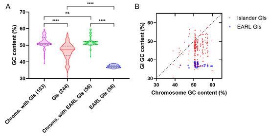 The EARL genomic islands possess a significantly low GC content. (A) Violin plots of the GC content of the genomic islands found in Enterobacteriaceae in the Islander database (GIs), their host chromosomes (Chroms. with GIs), the EARL genomic islands (EARL GIs) and the chromosomes that harbor the EARL GIs (Chroms. with EARL GIs). Kruskall–Wallis tests followed by Dunn’s multiple comparisons were used to assess differences between medians (α = 0.05, **** p < 0.0001). (B) Comparison of the GC content of genomic islands and the host chromosome. The dotted line represents a 1:1 correspondence. Data was obtained from the Islander database (15/10/19) [123] and the supplementary information from Piña-Iturbe et al. (2018) [50]. The 597 Enterobacteriaceae genomic islands stored in Islander were manually filtered to eliminate possible false positives (indicated in the database), putative prophages (>20% overlap with a PHAST call), duplicated genomic islands (islands with length ≥300 pb in the same species, the same integration site, and GC difference <1%), and islands found in plasmids, resulting in 244 genomic islands present in 103 host chromosomes. All the 56 EARL islands identified in [50] were used.