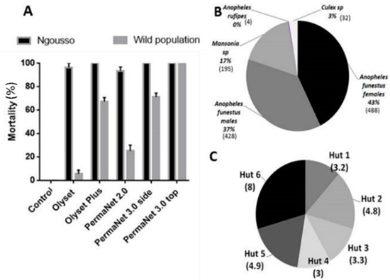 After 18 days collections, a total of 1147 mosquitoes were collected in the huts with untreated net. Out of the 1147, 488 were females An. funestus, 428 An. funestus males, 195 Mansonia spp., 32 Culex sp., and four An. rufipes. The average of An. funestus females collected per room after 18 days ranged from 3 to 8 per day (Figure 1C). No significant difference (p = 0.09; DF = 5) between the numbers of mosquitoes collected in the different huts was observed (Figure 1C).
