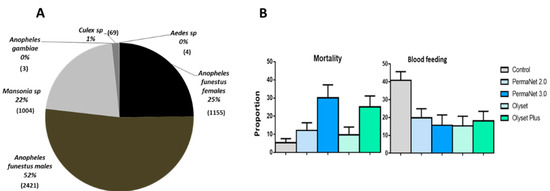Performance of the four LLINs in experimental hut trials against pyrethroid resistant An. funestus in Cameroon. (A) Mosquito species composition during the experimental hut study. (B) Proportion of mortality and blood feeding rate for the four LLINs against An. funestus.