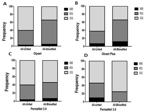 For Olyset net, a significant association was observed between the 119F_GSTe2 resistance allele and an increased ability to blood feed (21 blood fed and 92 unfed) when comparing the allelic frequencies (OR = 2; p < 0.05; CI 1.06–3.7) and the genotypic frequency of RS v SS (OR = 2.97; p < 0.001; CI 1.6–5.3) (Figure 3A and Table 5).