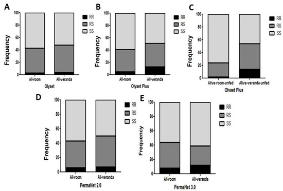 For Olyset, no association was observed between the L119F-GSTe2 mutation and exophily (67 in room and 48 in veranda) when comparing the allelic frequency (OR = 1.17; p ˃ 0.05; CI 0.6–2.2) (Table 4) and the genotypic frequency RS vs. SS (OR = 1.18; p ˃ 0.05; CI 0.6–2.1) (Figure 4A and Table 6).
