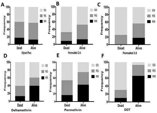 Association between L119F-GSTe2 mutation and ability to survive exposure to LLINs (cone assays) and WHO papers (bioassays): (A) Genotype distribution of L119F-GSTe2 between alive and dead mosquitoes after exposure to Olyset Plus showing no association; (B) Genotype distribution of L119F-GSTe2 between alive and dead mosquitoes after exposure to PermaNet 2.0 showing a significantly increased ability of resistant mosquitoes to survive (R vs. S: p < 0.01); (C) Genotype distribution of L119F-GSTe2 between alive and dead mosquitoes after exposure to PermaNet 3.0 showing a significantly greater ability of resistant mosquitoes to survive than that seen for PermaNet 2.0 (RR vs. SS: OR = 30.1; p < 0.001); (D) Genotype distribution of L119F-GSTe2 between alive (90 min) and dead (30 min) mosquitoes after exposure to deltamethrin showing a significantly greater ability of homozygote resistant mosquitoes to survive (RR vs. SS: OR = 4.6; p < 0.001); (E) Similarly for permethrin, homozygote resistant mosquitoes exhibit a significantly greater ability of to survive (RR vs. SS: OR = 4.8; p < 0.001); (F) For DDT, a much greater ability of mosquitoes with the resistance allele to survive exposure to DDT papers (RR vs. SS: OR = 66.7; p < 0.001).