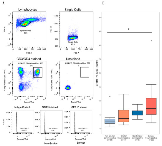 In the current investigation, we chose to focus on an understudied systemic effect of smoking, i.e., its impact on levels of CD3+CD4+ helper T (Th) cells expressing the G-protein-coupled receptor 15 (GPR15), a chemokine receptor encoded by the chromosome 3 gene GPR15. Originally identified as a coreceptor for simian immunodeficiency virus (SIV), human immunodeficiency virus 2 (HIV-2), and some human immunodeficiency virus 1 (HIV-1) strains [10,11,12], GPR15 has been linked to multiple smoking-associated diseases, including rheumatoid arthritis [13], inflammatory bowel disease [14,15,16], and multiple sclerosis [17], and psoriasis [18].