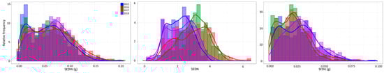 Distribution of the MA × CS progeny (n = 573) for SEDW, SEDN, and SEDA across four evaluated seasons. Graphs are presented as overlapped blue, red, green, and purple bar graphs for 2015, 2016, 2017, and 2018 seasons, respectively.