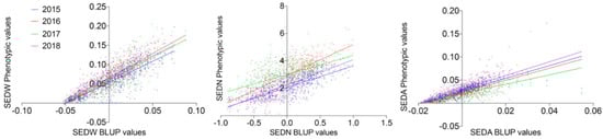 Correlation between phenotypic values for SEDW, SEDN, and SEDA with their respective best linear unbiased predictors (BLUPs). For all the four evaluated seasons (2015–2018), the average R2 was 0.7453, 0.5042 and 0.6204 for SEDW, SEDN, and SEDA, respectively, with p < 0.0001.