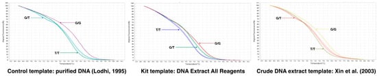Since the Arg-197-Leu mutation is causal with respect to the seedless phenotype, we developed a quantitative PCR (qPCR) high-resolution melting (HRM) curve analysis (qPCR-HRM) methodology that combines qPCR and HRM to obtain a rapid and cost-effective method suitable for testing a large series of samples. Homozygous seeded [G/G] and seedless [T/T] genotypes produce amplicons with melting temperatures (Tm) of 76.0 and 74.7 °C, respectively, whereas the heteroduplex presented a specific curve with two melting peaks of 74.7 and 71.9 °C (Figure S6). The developed marker is suitable for the use of a gDNA template purified by commercial kits, including the popular [26] CTAB-based extraction protocol, the crude extract-based protocol available in commercial kits, and the protocol described by Xin et al. [27], with minor modifications described in the Materials and Method section. The three variants were easily and unequivocally distinguished (Figure 7 and Supplementary Figure S6).