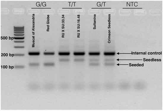 Tetra-ARMS PCR electrophoretic analysis for the detection of the SNP [G/T] with the e7_VviAGL11 marker. The SNP marker is responsible for the Arg-197-Leu mutation in the coding sequence of VviAGL11. The electrophoretic profile compares seeded genotypes (Muscat of Alexandria and Red Globe) with homozygous seedless (RU × SU:16.48 and 33.34 experimental genotypes) and heterozygous seedless (Sultanina and Crimson Seedless) genotypes. Seeded and seedless alleles produce specific products of 115 and 150 bp, respectively. Both alleles amplify the internal control product of 212 bp. A developed marker is suitable for the application in simple routines based on standard PCR and agarose electrophoresis.