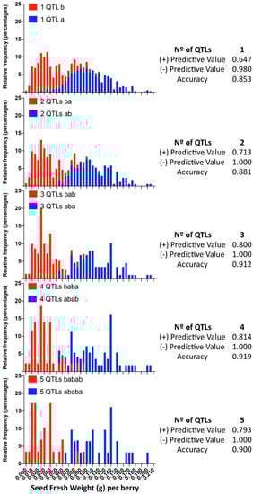Considering the additive effect of QTLs, the developed predictive model includes the simultaneous evaluation of multiple QTLs, which were selected methodically and added one by one according to their phenotypic individual effect (Table 1) in decreasing order (Table 2). With each added marker, the size of the population that represents the ideotype is divided by half; thus, due to the size of the population (n = 573), the effect of more than five markers was difficult to test by one-way ANOVA. Starting with the largest-effect QTL for each trait that explains 52.11%, 9.15%, and 43.87% for SEDW, SEDN, and SEDA, respectively, and with five markers for each trait, we were able to increase the total phenotypic variation up to 55.98%, 21.72%, and 51.92% for these traits (Table 2). In phenotypic values, SEDW decreases 25.2% compared to the use of only the VviAGL11-derived marker, and for SEDN and SEDA, the phenotypic values decrease 32.4% and 36.2% compared to the sole use of the largest-effect QTL.