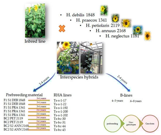 The transfer of genes for resistance to broomrape from wild sunflower species into cultivated sunflower is done by interspecies hybridization [2,28]. Introgression of resistance genes from wild species is not an easy task because many other unwanted (wild), agronomically undesirable traits, are introduced during this process. After the introduction of resistance genes, a large number of crossings and selections have to be carried out in order to improve important agronomic traits and maintain desired level of broomrape resistance at the same time (Figure 1).